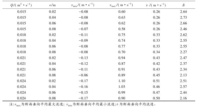 流速沿斷面分布的均勻特性可以通過流速分布不均勻系數(shù)進行表征,通過所選取斷面*大流速和*小流速的差值與該斷面平均流速的比值,δ值越大表明浮體結構的存在對水流斷面流速的分布產生的影響較大。表2中,當來流流量相同時,流速的不均勻系數(shù)多數(shù)隨e的增大而減小。浮體結構位置較小時,主流為浮體結構上部的水流。隨著浮體結構位置的上升,來自上游的水體逐漸分成浮體結構上部和下部的兩股主流,流速分布的不均性減小。浮體結構位置及所處水位條件相同時,來流流量的增大,區(qū)域的平均流速增大,因此流速不均勻性減小。