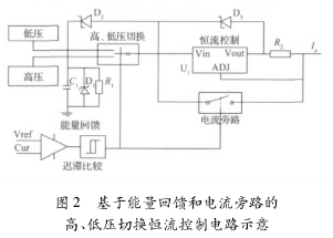 高、低壓切換恒流控制電路是勵磁控制系統(tǒng)中的關鍵部分,由高、低壓電源、能量回饋電路、高低壓切換電路、恒流控制電路、電流旁路電路和遲滯比較電路組成,其電路原理如圖2所示。