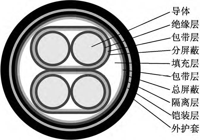 該新型電纜的結(jié)構(gòu)如圖1所示。導體為單股退火鍍錫軟銅線,以提高導體的導電性和防腐蝕性。在導體外繞包一層薄F4(聚四氟乙烯)半導電帶,有利于降低導體和絕緣之間的摩擦起電噪音。絕緣采用材料較為純凈、介電常數(shù)較小、具有一定彈性的聚丙烯絕緣級材料,并采用擠壓式擠出,減小絕緣層與導體的間隙。采用對絞組作為信號傳輸線,由于在兩根傳輸線上感應的電壓接近相等,減小了電壓差值,提高了信號傳輸穩(wěn)定性;對絞組由兩種不同顏色絕緣線芯組成,相鄰線對對絞節(jié)距應不大于100mm。對絞分屏蔽組(即對對絞組進行分屏蔽,每對對絞組外繞包兩層聚酯帶和一層厚0.04mm鋁塑復合帶繞包,內(nèi)置一根7×0.26mm鍍錫銅絞線作引流線)有利于對不同對絞組之間信號串音的抑制和隔離。對絞分屏蔽組同心式絞合成纜,在對絞分屏蔽組間填充非吸濕性材料,以保證纜芯圓整。在成纜纜芯外繞包兩層聚酯帶,再采用鋁塑復合帶繞包,內(nèi)置鍍錫銅線作引流線,以提高電纜電磁屏蔽能力。總屏蔽層外擠包隔離層(隔離護套),隔離層采用絕緣級低密度聚乙烯材料。隔離層外采用鎧裝層,鎧裝材料為高導磁合金鋼帶,其為強磁材料,可將外來的磁通大部分限制在鎧裝層的外表面上(僅有少部分能進入被屏蔽的空間);鎧裝時對高導磁合金鋼帶采用縱包焊接,確保其形成一連續(xù)圓柱管;鎧裝層可提高電纜抗電磁干擾水平以及對電纜進行加強,減少電纜振動引起的電動勢。外護套采用藍色軟PVC(聚氯乙烯)護層級電纜材料擠包,實現(xiàn)電纜防護。
