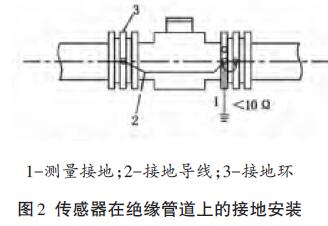 傳感器安裝在塑料管道或內(nèi)壁有絕緣涂層、襯里的管道上,兩端應(yīng)安裝接地環(huán)(或帶有接地電極的金屬短管),然后用導(dǎo)線連接,使管內(nèi)流動的介質(zhì)與大地短路,具有零電位(見圖2)。