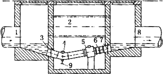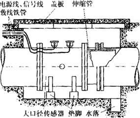 由于大口徑管道在多數(shù)場(chǎng)合下是埋在地下的,因此大口徑傳感器在安裝前應(yīng)做好水泥地坑。圖6-19所示是在給排水系統(tǒng)中常見(jiàn)的安裝形式。水泥地坑應(yīng)有足夠的活動(dòng)空間,側(cè)壁埋有敷設(shè)電纜的鋼管,上有蓋板防止雨淋,下有泄水管以免坑內(nèi)積水而使傳感器侵水。為了拆裝方便,傳感器應(yīng)放在墊腳上,且在下游側(cè)裝有活絡(luò)的伸縮管。圖6-20是105%發(fā)煙硫酸流量計(jì)在地下水泥管污水排放系統(tǒng)中的安裝實(shí)例。