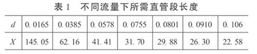 3.直管段長(zhǎng)度和生物柴油流量計(jì)精度的初步預(yù)測(cè)在工程設(shè)計(jì)中,根據(jù)流體性質(zhì)、流量和雷諾數(shù)確定α和d值。這樣,按照式(5)就可以依不同的流量計(jì)精度要求,對(duì)直管段長(zhǎng)度進(jìn)行初步預(yù)測(cè),或確定直管段長(zhǎng)度后,對(duì)流量計(jì)的精度做初步預(yù)測(cè)。當(dāng)δ= 0.2%時(shí),不同流量下所需直管段長(zhǎng)度見表1。