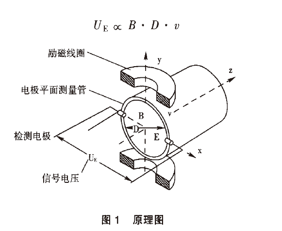 產(chǎn)生與流量成比例的感應(yīng)電勢,流體中產(chǎn)生的感應(yīng)電動勢被位于管子徑向兩端的一對電極拾取,該信號電壓uE與磁場強度B、電極間距離D和平均流速穢成正比。磁場強度B和電極距離D是常數(shù),所以信號電壓與平均流速口成正比。計算公式如下:
