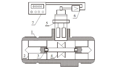 1 殼體,2 前導流板,3 軸承,4 渦輪,5 變送器,6 前置放大器,7二次儀表