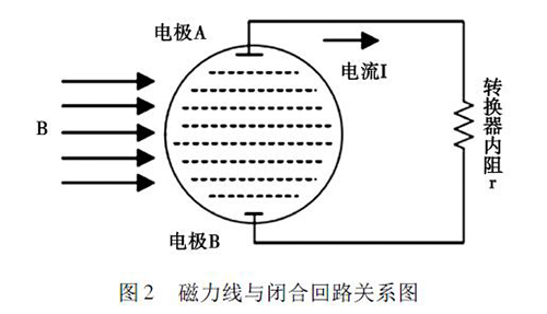 2. 1 正交干擾衛(wèi)生型卡箍電磁流量計(jì)的磁路系統(tǒng)包含有兩個(gè)勵(lì)磁線圈,而導(dǎo)管內(nèi)的液體與傳感器電極及轉(zhuǎn)換器結(jié)構(gòu)組成了一個(gè)閉合的回路,如圖2 所示。理論情況下,磁力線( 圖中B) 應(yīng)與閉合回路相平行,但是由于裝配過程中的誤差,導(dǎo)致磁力線不可能完全平行于這一閉合回路,出現(xiàn)部分磁力線成一定角度穿過回路的現(xiàn)象,這引起了即使沒有液體流動(dòng)的情況下,傳感器的電極上也會(huì)產(chǎn)生感應(yīng)電動(dòng)勢,就形成了正交干擾的基本形式。