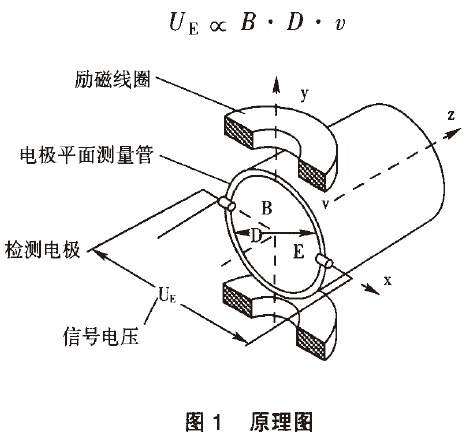 產生與流量成比例的感應電勢,流體中產生的感應電動勢被位于管子徑向兩端的一對電極拾取,該信號電壓uE與磁場強度B、電極間距離D和平均流速穢成正比。磁場強度B和電極距離D是常數,所以信號電壓與平均流速口成正比。計算公式如下: