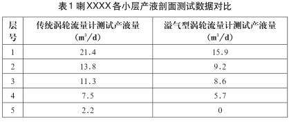 圖1、圖2為該井全井流量測試曲線,從圖1可以看出使用傳統渦流量計測試時該井流量曲線受到井內原油脫氣影響產生了較大跳動,對流量測試產生了較大的干擾,測試結果為56.2m 3 /d。而采用溢氣型渦輪燃氣流量計測試后,測試曲線較為平穩、沖次明顯(圖2),渦輪沒有受到原油脫氣影響,說明溢氣型短節排氣效果良好,全井流量測試結果僅為39.4m 3 /d。為了進一步對比,地質部門對該井進行了罐車量油,量油結果為產液39.1 m 3 /d。由此可見,溢氣型渦輪燃氣流量計流量測試結果明顯優于傳統的渦輪燃氣流量計測試結果,那么其測試的各小層產液數據也就更加準確,因此測試脫氣嚴重的抽油機井產液剖面時應該盡可能采用溢氣型渦輪燃氣流量計。表1為喇XXXX井各小層流量測試結果,可以看出使用傳統渦輪燃氣流量計測試的各小層流量均高于溢氣型渦輪燃氣流量計測試結果。測試層5時傳統渦輪燃氣流量計測試結果為2.2 m 3 /d,而實際上渦輪轉動是氣體沖擊導致的,采用溢氣型渦輪燃氣流量計后發現該層產液量低于啟動排量無法測試。