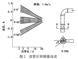 2000年上海原水公司擬在已建成的某泵站加裝DN2200液蠟流量計,但彎管下游安裝位置的前直管長度明顯不符合規定中5D~10D(D為管徑,下同)的要求,此時,影響測量誤差有多大呢?