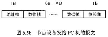 在分體式電磁流量計等節點設備和C機通信的過程中,由地址幀、命令幀、數據幀、校驗和可組成各種功能不同的報文。由于采用主從工作方式來實現通信,分體式電磁流量計等節點設備僅能接收并執行PC機發送來的控制命令,而不能發送命令給PC機。因此,由PC機發往流量計等節點設備的報文一般包括一個地址幀,一個命令幀,若干個數據幀和一個校驗和,其報文格式圖.6a5所示;而由流量計等節點設備發往PC機的報文一般包括一個地址幀,若干個數據幀和一個校驗和,其報文格式如圖6.5b所示。