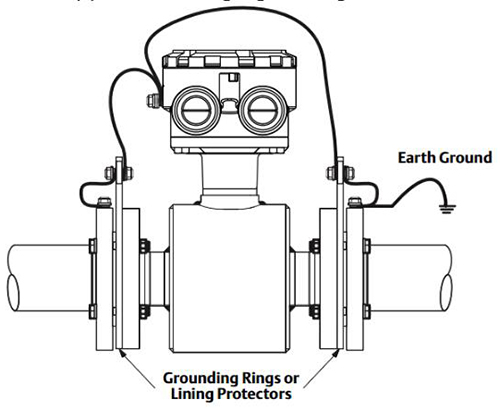如前圖所示,當靠近排水口流量計的管道不能提供良好的流體電連接時,需要接地環或接地電極。也就是說,管道內襯或由非導電材料制成。