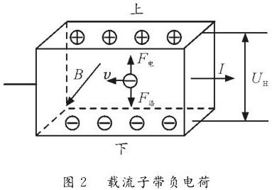 反之,如圖2所示,若載流子帶負電荷,則載流子在洛倫茲力作用下會向下偏轉,導體下表面積累負電荷。同時,上表面失去負電荷而帶上正電,從而使上表面電勢高于下表面。