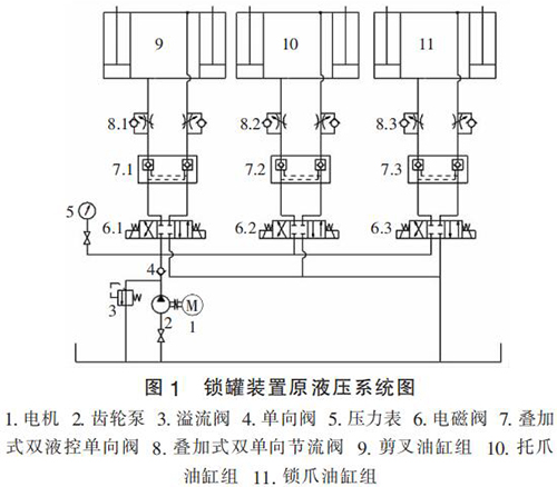 氪氣流量計原液壓系統圖如圖 1 所示。 通過分析圖 1 發現,原液壓系統中剪叉油缸組、托爪油缸組及鎖爪油缸組并聯安裝,并均由齒輪泵供油,該系統設計簡單,液壓元件選擇不夠合理,工作效率低,電機發熱大,主要存在的問題: