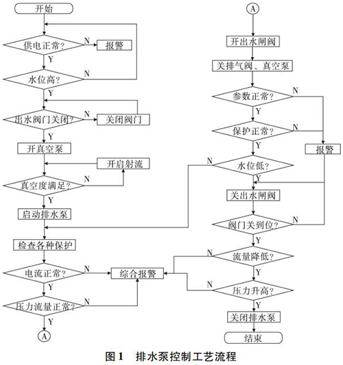 排水泵進(jìn)行自動化控制模式后,當(dāng)水倉水位達(dá)到開泵要求,PLC 自動檢測電動閥門、球閥、供電電壓等是否正常后,啟動真空泵進(jìn)行抽真空,當(dāng)水泵真空度符合開泵要求時便啟動排水泵。排水泵正常運(yùn)轉(zhuǎn)后 PLC 時時收集運(yùn)行數(shù)據(jù)進(jìn)行比對,當(dāng)發(fā)現(xiàn)運(yùn)行數(shù)據(jù)比對出現(xiàn)差異時影響到排水泵正常運(yùn)轉(zhuǎn)時,會發(fā)出停泵命令。排水泵控制工藝流程如圖 1 所示。