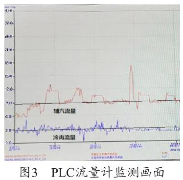 通過圖3可以看出,PLC 上輔汽測量用的沼氣流量計的量程設(shè)置為30t/h,現(xiàn)場設(shè)備量程實(shí)際為5t/h,兩者嚴(yán)重不符,因此測量值8.286t/h 為錯誤值,需要對程序進(jìn)行修改。