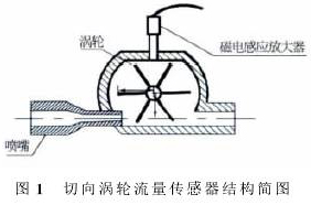 高溫導(dǎo)熱油流量計(jì)基本構(gòu)造見圖1。被測(cè)流體在流經(jīng)葉輪之前流道會(huì)減縮,流速增加,流體經(jīng)過葉輪后葉片旋轉(zhuǎn),磁電傳感器記錄葉片轉(zhuǎn)動(dòng)頻率,得到被測(cè)流體相對(duì)應(yīng)的流量。