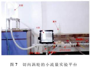 為了驗(yàn)證仿真的準(zhǔn)確性,通過室內(nèi)實(shí)驗(yàn)對(duì)其驗(yàn)證。切向渦輪采用可視化研究平臺(tái),整個(gè)渦輪的結(jié)構(gòu)都采用亞克力板雕刻組裝而成。如圖7所示,水箱主要提供穩(wěn)定水壓,水平切向渦輪做成開口系統(tǒng)并放置在實(shí)驗(yàn)支撐架上,前置閥門可控制水流,在需要更換切向渦輪的零件時(shí)可關(guān)閉,控制閥門主要是控制流經(jīng)切向渦輪的流量,流量測(cè)量仍采用傳統(tǒng)可靠的容積時(shí)間法。實(shí)驗(yàn)時(shí)以染色劑作為示蹤劑,以觀察流場(chǎng)的分布情況。