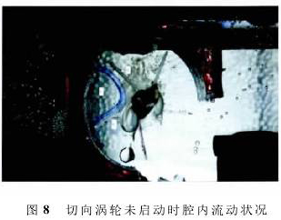 如圖8所示,記錄的是未啟動(dòng)時(shí)切向渦輪內(nèi)的流場(chǎng),水從圖8左側(cè)流入渦輪,從右側(cè)流出,實(shí)驗(yàn)時(shí)水的流速很低(0.05m3/d),腔體1中的流動(dòng)可近似看作不可壓縮無旋繞角流動(dòng),此時(shí)流體在腔體1中的速度可看成對(duì)稱分布,由伯努利方程算得的壓強(qiáng)也是對(duì)稱分布,此時(shí)2個(gè)壁面幾乎沒有壓強(qiáng)差,所以渦輪未啟動(dòng)。