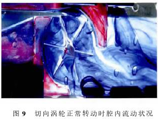 圖9記錄的是切向渦輪正常轉(zhuǎn)動(dòng)時(shí)的流場(chǎng),圖9中水從左向右流動(dòng),實(shí)驗(yàn)時(shí)水速較快(1m3/d),渦輪葉片順時(shí)針轉(zhuǎn)動(dòng)。水速變大后,擾動(dòng)變大,不再是無旋繞角流動(dòng),腔體1中流體形成一個(gè)運(yùn)動(dòng)的旋渦,導(dǎo)致腔內(nèi)壓強(qiáng)分布不再對(duì)稱,產(chǎn)生壓差,致使渦輪葉片轉(zhuǎn)動(dòng),旋渦在隨葉片運(yùn)動(dòng)到腔體2中時(shí)逐漸耗散消失。數(shù)值仿真的計(jì)算結(jié)果與物理實(shí)驗(yàn)的結(jié)果基本一致。