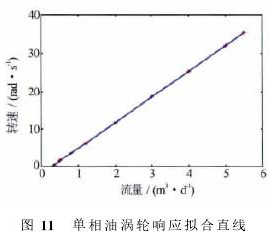 采用同樣的方法,對(duì)單相油條件下渦輪響應(yīng)規(guī)律進(jìn)行研究(見圖11),測(cè)得單相油的啟動(dòng)排量為0.08m3/d。對(duì)單相油的實(shí)驗(yàn)結(jié)果進(jìn)行擬合,可得單相油的響應(yīng)曲線為ω=6.73Q-6.72。與水對(duì)比而言,油的擬合曲線斜率更大,即隨著流量增加轉(zhuǎn)速增加得略快。