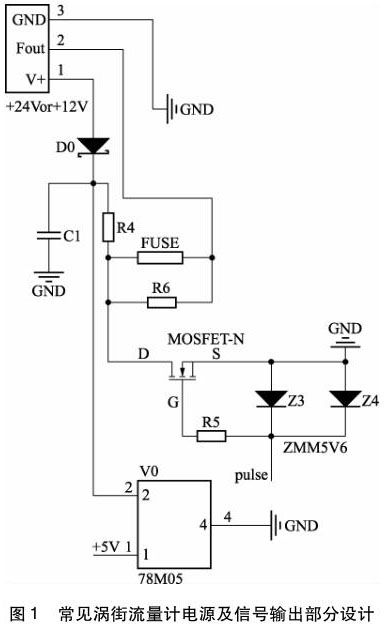 從圖1 中可以看到,供電電源 +24 V, +12 V均可,直流電源通過瓷片電容 C1 濾掉部分紋波,然后通過線性穩壓芯片 78M05,得到 + 5 V 電壓,為后面的渦街蒸汽流量計信號處理電路供電,若要再得到 3. 3 V 電壓,通常會在 78M05 后再加一片線性穩壓芯片 LM1117-3. 3,為了節約成本,供電電路沒有做 EMS 設計。同時,脈沖輸出部分,僅通過一個 MOS 管和兩個穩壓管,也沒有 EMS 方面的設計考慮。