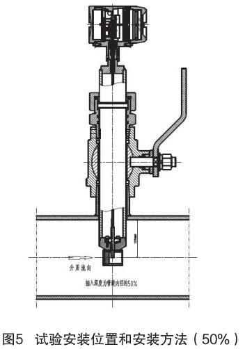 對氣體渦輪流量計和插入式電磁流量計的結構原理進行分析,插入式電磁流量計的信號采集點在標校管道內12.5% 為宜,因它屬電磁類流量計,而煙氣流量計是根據“卡門渦街”原理進行測量管道內流量,根據標校管道內層流和湍流的分析,以及氣體渦輪流量計獨特的探頭結構形式,確定氣體渦輪流量計的插入深度為標校管道內 50%,試驗安裝位置和安裝方法如圖 5 所示。