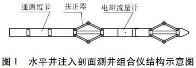 水平井注入剖面測井組合儀是針對水平井籠統(tǒng)注水井注入剖面測井專門研制的,儀器結(jié)構(gòu)如圖 1 所示。井下儀器主要包括通用短節(jié)( 遙測、溫度、壓力和 CCL) 、硫酸銅流量計和滾輪式扶正器。測量參數(shù)包括流量、溫 度、壓力、自然伽馬和深度。流量計采用的是非集流硫酸銅流量計和集流型硫酸銅流量計,對于注入量較大的井采用非集流硫酸銅流量計,注入量較小的井采用集流型硫酸銅流量計,測量方式采用定點測量。儀器采用遙測技術(shù)實現(xiàn)了多參數(shù)同時測量和傳輸,儀器外徑 38 mm,耐壓80 MPa,耐溫150 ℃,流量測量范圍為1 ~ 800 m3 /d,測量精度 ± 5% 。