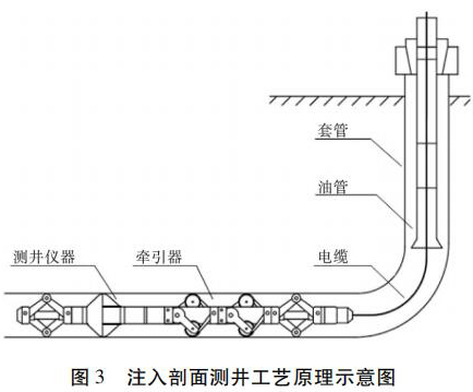 水平井注水井注入剖面測井工藝原理如圖 3 所示。在垂直井段,儀器在重力作用下可以通過注入管柱下入到井內(nèi),注入管柱下端須裝有喇叭口,且喇叭口應在造斜點以上,保證測井完成后儀器順利起出,不發(fā)生卡儀器問題。儀器通過喇叭口以后在重力作用下繼續(xù)向下移動,當儀器不能靠重力下移時,啟動牽引器,利用牽引器將儀器推送到井底,上提電纜過程中進行測井。