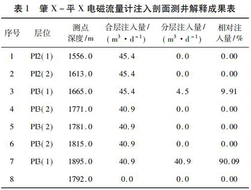 2017 年 9 月在大慶油田采油八廠肇 X - 平 X 水平井注水井中*次進行了水平井注入剖面測井現(xiàn)場試驗。該井斜深2 055. 42 m,水平段長度為568. 46 m,試驗目的是通過注入剖面測井了解該井各層段的注水情況,同時對水平井測井工藝、儀器的適用性、井下牽引器及井口輔助裝置等設(shè)備的工作有效性和可靠性進行評價。現(xiàn)場試驗中,在密閉條件下錄取到了該井的注入剖面測井資料,進行了重復測量,重復測量結(jié)果在誤差允許范圍內(nèi),測井成果見表 1。該井施工壓力 6. 0 MPa,注入量45. 4 m3 /d,有 7 個射孔層,分 8 個測點測量,2 個層有吸入顯示,其中,P13( 1) ( 1 734 ~ 1 767 m) 層絕對吸入量4. 5 m3 /d,相對吸入量為9. 91 %,P13( 1) ( 1 899 ~1 943 m)層絕對吸入量 40. 9 m3 /d,相對吸入量為 90. 09% ,測井成果見表 1。通過與甲方的交流,再結(jié)合該井的動靜態(tài)資料及周圍井的工作狀況,采油廠的地質(zhì)人員認為本次測井結(jié)果能比較準確地反映該井的注入情況。