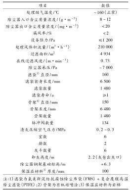 (2) 新建布袋除塵及氣力輸灰管道式渦街流量計(jì)。采用長袋低壓脈沖袋式(外濾式)除塵器,煙氣體積流量為 210 000 m 3 /h,初 始 含 塵 質(zhì) 量 濃 度 為 8 ~12 g/m 3 ,除塵占地面積為 20 m 2 (5 m ×4 m)。除塵器主要由本體、壓縮空氣系統(tǒng)、控制系統(tǒng)、輸灰系統(tǒng)組成。除塵器后進(jìn)脫硫塔煙塵質(zhì)量濃度≤20 mg/m 3 。除塵器的總阻力≤1 200 Pa。新建布袋除塵器型號(hào)為 LCMD-4934,設(shè)計(jì)參數(shù)見表 2,其中清灰方式采用離線清灰,除塵器布置方式為矩形布置,電氣控制采用可編程邏輯控制器(PLC)。