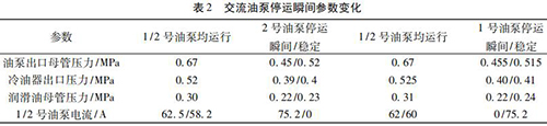 通過內部旁通將冷油與熱油混合,經過銅粉- 煤油 - 蠟感溫元件控制冷熱油混合比例,將油溫調節到 49 ℃。一臺一體式電磁流量計穩定運行,油泵出口母管壓力 0. 5 MPa,潤滑油母管壓力 0. 24 MPa,均屬于正常情況,而兩臺交流油泵并列運行時,停運其中一臺交流油泵瞬間會觸發電磁流量計出口母管壓力開關動作,說明停運瞬間油壓發生波動,且油泵出口母管油壓波動至小于 0. 45 MPa。正常運行時電磁流量計出口油溫 71.5 ℃,冷油器出口溫度45 ℃,混合后潤滑油母管溫度52.5 ℃,由能量守恒定律可知,經過冷油器的油量/不經冷油器的油量= ( 71.5-52.5) ÷ ( 52.5- 45) = 2. 53,說明有 70% 左右的油量經過冷油器。當 2 臺一體式電磁流量計運行時油量大于單泵運行,其中一臺電磁流量計瞬間停運時油量減少,尤其是經過冷油器的油量大量減少,油量在溫控閥二次分配過程中出現調節異常,導致油壓過大波動。為檢驗溫控閥工作情況,保持 1 號、2 號交流油泵運行,選取機組正常帶負荷運行時油溫 52 ℃,分別停運 1、2 號交流油泵,觀察 1、2 號交流油泵停運瞬間油泵出口母管壓力波動情況,試驗各參數變化見表 2。