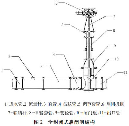 包括進水管、直管、出水管、夾持式渦街流量計組和啟閉機組,進水管、直管、出水管從左到右依次連接,夾持式渦街流量計組安裝在直管和出水管之間且位于出水管的入口處,夾持式渦街流量計組通過聯結桿與啟閉機組的輸出端連接。為防止泥沙淤積影響啟閉,夾持式渦街流量計采用閘板式啟閉結構。密封式啟閉閘為整體封閉管道式,全部采用不銹鋼材料,水流通過管道流出讓整個閘井內干燥無水。伸縮套管與波紋管的設計讓檢修與清理淤泥更加方便。夾持式渦街流量計裝有荷載限制器,其布置受力明確、結構緊湊、動作可靠。當吊具上的荷載達到額定值的 110%時,或電機電流超過額定電流 150%時,系統自動切斷操作電源以保護設備安全。