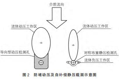 新衛生渦輪流量計采用拋物面導向型結構作為動壓測點,采用對稱自補償型式的靜壓測點,可以有效地解決來流方向偏流時信號的穩定采集,來流偏離管道軸線時,可以維持輸出差壓基本不變,如圖2所示。