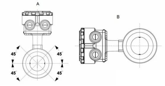 如果兩個(gè)測量電極處于 3 點(diǎn)鐘和 9 點(diǎn)鐘位置或與水平方向成 45 度以下角度,如 圖 3-4 左側(cè)所示,則傳感器電極的朝向正確。避免使傳感器的頂部與垂直位置成 90 度角(如 圖右側(cè)所示)的任何安裝朝向。
