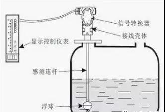 原理: 浮球液位計結構主要基于浮力和靜磁場原理設計生產的。帶有磁體的浮球(簡稱浮球)在被測介質中的位置受浮力作用影響:液位的變化導致磁性浮子位置的變化。浮球中的磁體和傳感器(磁簧開關)作用,使串連入電路的元件(如定值電阻)的數量發生變化,進而使儀表電路系統的電學量發生改變。也就是使磁性浮子位置的變化引起電學量的變化。通過檢測電學量的變化來反映容器內液位的情況。
