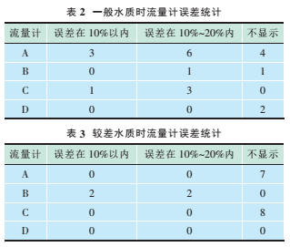 表1中,“—”表示超聲波流量計因接收信號差而不顯示累計流量,誤差>20%的超聲波流量計累計流量表示因接收信號質(zhì)量差導致的儀器測量錯誤。對表1中的數(shù)據(jù)進行分類處理,以便得到一般和較差水質(zhì)2種情況時4臺流量計的誤差統(tǒng)計。表2和表3分別為為一般和較差水質(zhì)時的流量計誤差統(tǒng)計。
