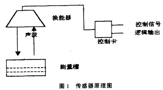 常見的液位傳感器有磁浮筒式、壓力式等,磁浮筒式傳感器要安裝在被測介質(zhì)中,長時間使用易被腐蝕,而壓力傳感器輸出線性較差且成本較高。超聲波傳感器的特點(diǎn)是使用時與液面脫離接觸,無腐蝕問題,且價格低廉。超聲波傳感器由控制卡及換能器構(gòu)成,如圖I。