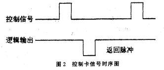 其外部特性如圖2所示。其工作原理是,每當(dāng)在“控制信號”端加一正脈沖(寬度0.2ms),控制卡便通過換能器發(fā)一束超聲波,當(dāng)超聲波遇被測污水反射后又被換能器接收,控制卡便通過“邏輯輸出”端輸出一“返回脈沖”。通過計(jì)量“控制信號”到“返回脈沖”之間的時間T便可按下式計(jì)算出換能器距被測污水表面的距離H,由于安裝時換能器固定在污水的上方(高度不變),因此,換能器距污水底部的距離HO(其值已知)減去H即為污水液位H1。