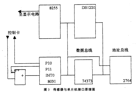 圖3中,單片機(jī)8031、74373和2764組成單片機(jī)核心電路,8255為顯示電路接口,DSl220為不揮發(fā)RAM,用其存儲流量可保證斷電后流量不丟失。工作時8031每隔一個采樣周期先啟動定時器T1,然后通過PIO引腳向控制卡發(fā)控制信號,換能器發(fā)一聲波經(jīng)被測污水反射由換能器接收,控制卡的邏輯輸出端輸出一脈沖,脈沖信號經(jīng)過或門進(jìn)入INTO腳,引起中斷請求。在中斷服務(wù)程序中從定時器中取出定時值,計(jì)算出對應(yīng)的液位。由于傳感器在發(fā)出聲波后,在4MS以內(nèi)會產(chǎn)生無用的盲區(qū)脈沖,所以在P10向控制卡發(fā)控制脈沖的同時,通過P11引腳發(fā)一個4ms的高電平封鎖信號,防止“盲區(qū)脈沖”通過或門進(jìn)入INTO引腳。